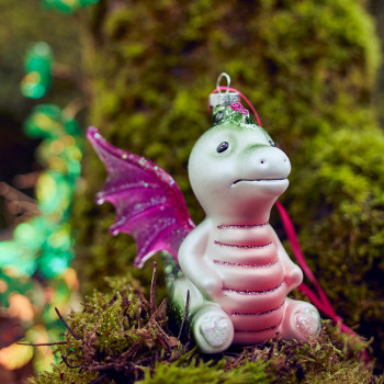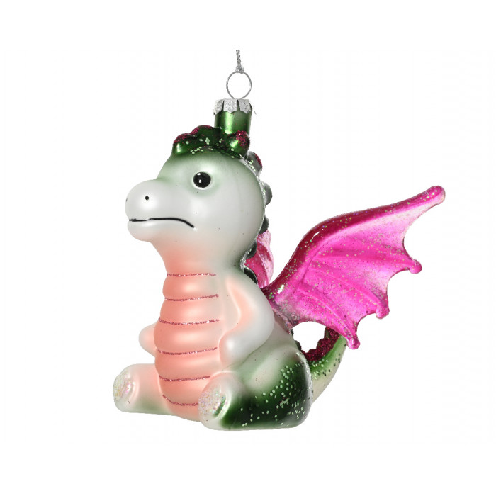 Üvegből készült, függeszthető, sárkányt ábrázoló dísz különleges színekben, csillogó elemekkel díszítve.