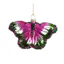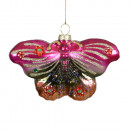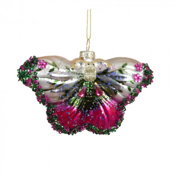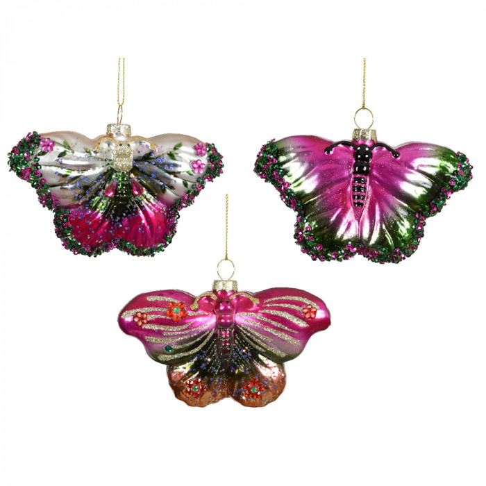 Üvegből készült, függeszthető, pillangó alakú dísz különleges színekben, gyöngyökkel díszítve, 3 különböző modellben.