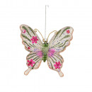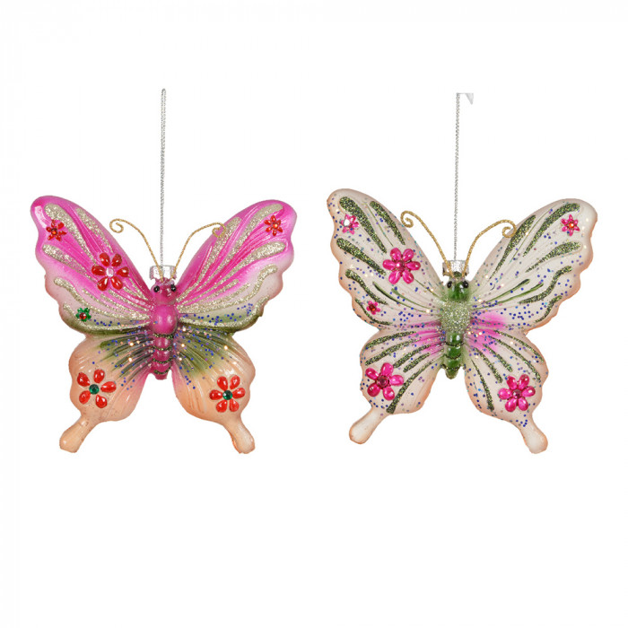 Üvegből készült, függeszthető, különleges mintákkal díszített, pillangó alakú dísz 2 különböző színben: zöld és rózsaszín.
