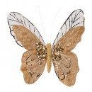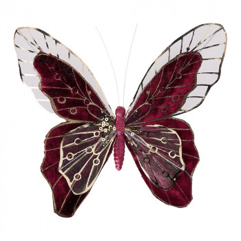 Műanyagból készült, bársonyos felületű, arany elemekkel és hálós szárnnyal díszített, csipeszes pillangó dísz 2 különböző színben: bordó és arany.